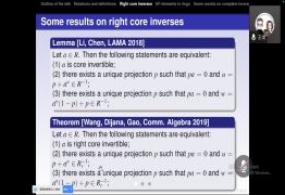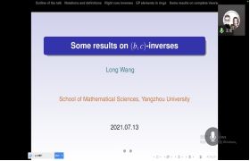 王龙副教授介绍了广义逆理论的研究背景与应用,结合自身的科学研究,报告了近几年对于(b,c)逆及相关广义逆的研究成果。从研究的内容,研究方法和研究思路这几个方面展开,着重讲述了单边(b,c)逆,右核逆的刻画问题。结合半群理论Green关系,讨论了交换Mary逆的相关定义和性质。